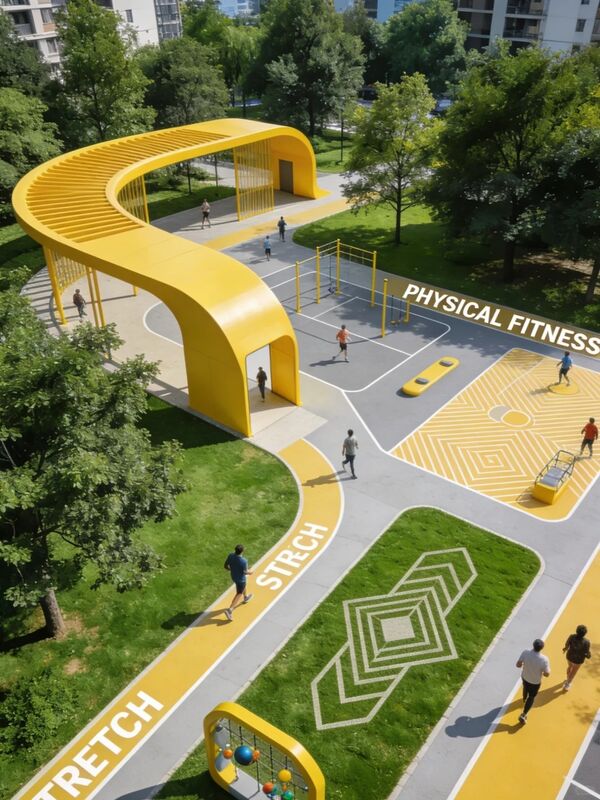 • Fitness Circuit Elements: Simple, artistic pull-up bars, balance beams, and stretch stations for adults